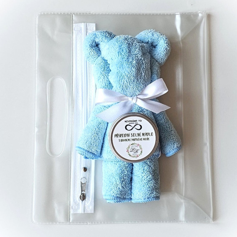 Cestovní sada obsahuje přírodní mýdlo, ručník a praktickou cestovní taštičku...