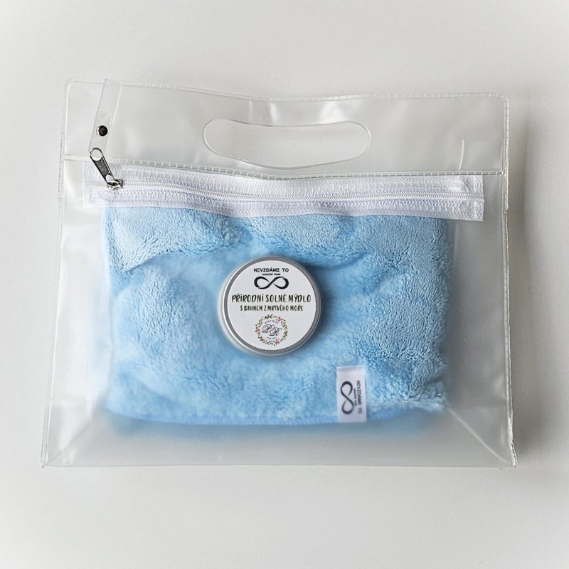 Cestovní sada obsahuje přírodní mýdlo, ručník a praktickou cestovní taštičku se zipem pro opakované použití.