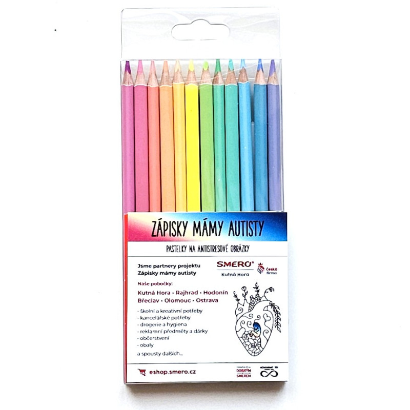 Sada 12 kusů pastelek v plastovém pouzdru s nálepkou "Zápisky mámy autisty" obsahuje: