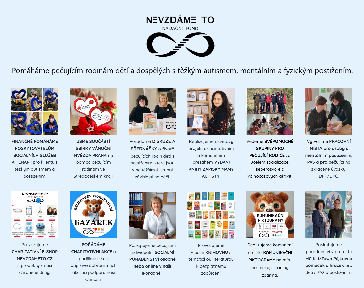 Nadační fond NEVZDÁME TO má statut zaměstnavatele na chráněném trhu práce a zaměstnává právě osoby s mentálním postižením a poruchou autistického spektra s potřebou pracovní asistence a pečující rodiče.